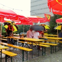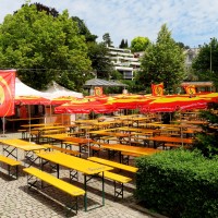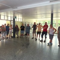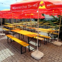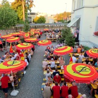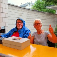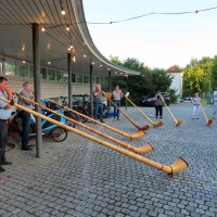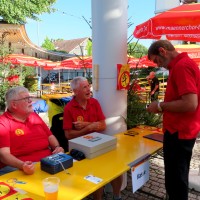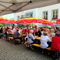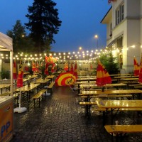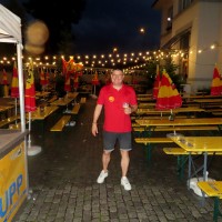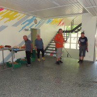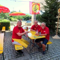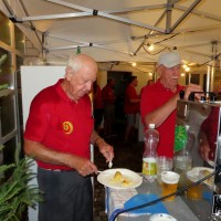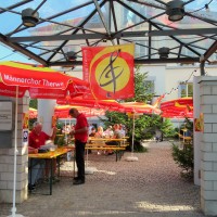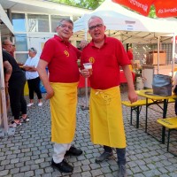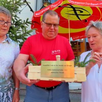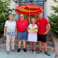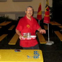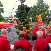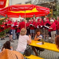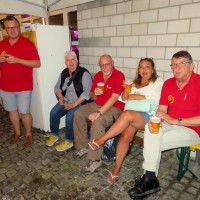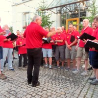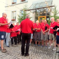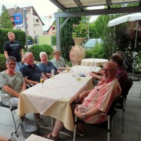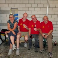Voll stolz zeigt uns Otti hier die Auszeichnung nach der Veteranenehrung, begleitet von einer Delegation des Männerchors Therwil. Die roten Bäckli der Herren seien wohl auf die Freude an diesem Ereignis zurückzuführen. Es wird allerdings gemunkelt, dass es da wohl auch etwas zu Trinken gab.