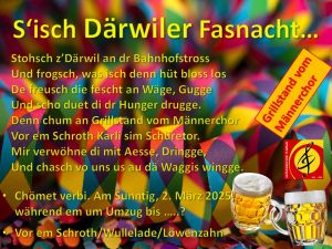 Der Männerchor im Bibo Veröffentlicht am 20. Juli 2025 von Lucas Heinis Kommentar « Alle Veranstaltungen Diese Veranstaltung hat bereits stattgefunden. Fasnachts-Grill März 2 @ 13:00 - 19:00 « Unterhaltungsabend 2025 Generalversammlung MCT » Zum Kalender hinzufügen zu Google Kalender hinzufügen iCalendar Outlook 365 Outlook Live Details Datum: März 2 Zeit: 13:00 - 19:00 Veranstaltungskategorien: Dorfanlass, Oeffentlich Veranstalter Männerchor Therwil Veranstalter-Website anzeigen Veranstaltungsort Bahnhofstrasse, vor em Schroth